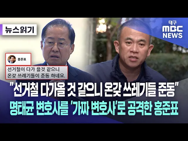 홍준표 대구시장은 "선거철이 다가올 것 같으니 온갖 쓰레기들이 준동한다"라며 자신을 정조준하는 명태균 측을 향해 격한 발언을 했습니다. 홍 시장은 2월 21일 자신의 SNS에 명 씨 변호인을 겨냥해 "변호사를 양산하다 보니 범죄인을 대신해 방송에 나가서 거짓말이나 퍼트리는 가짜 변호사들이 난무하고, 선거철이 다가...