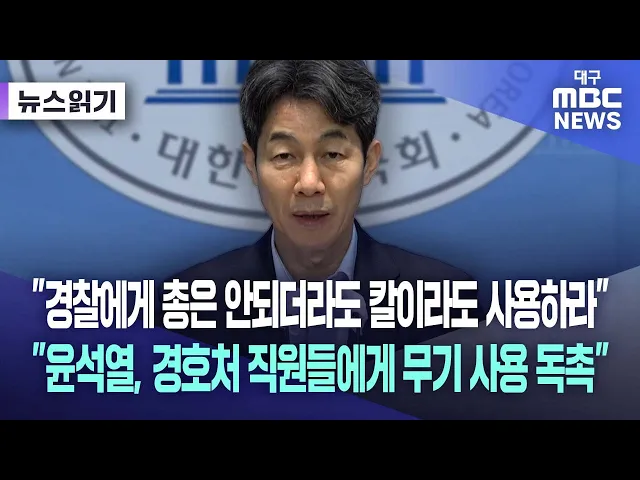 윤건영 더불어민주당 국회의원은 1월 13일 기자회견을 열고 "윤석열 대통령이 경호처 직원들에게 무기 사용을 독촉했다는 제보를 받았다"라고 밝혔습니다.윤 의원은 "윤 대통령이 1월 12일도 경호처 간부 6명과 오찬을 했다"라면서 "다시 한번 무기 사용을 얘기했고, 이때 '나를 체포하려고 접근하는 경찰들에게 총은 안되...