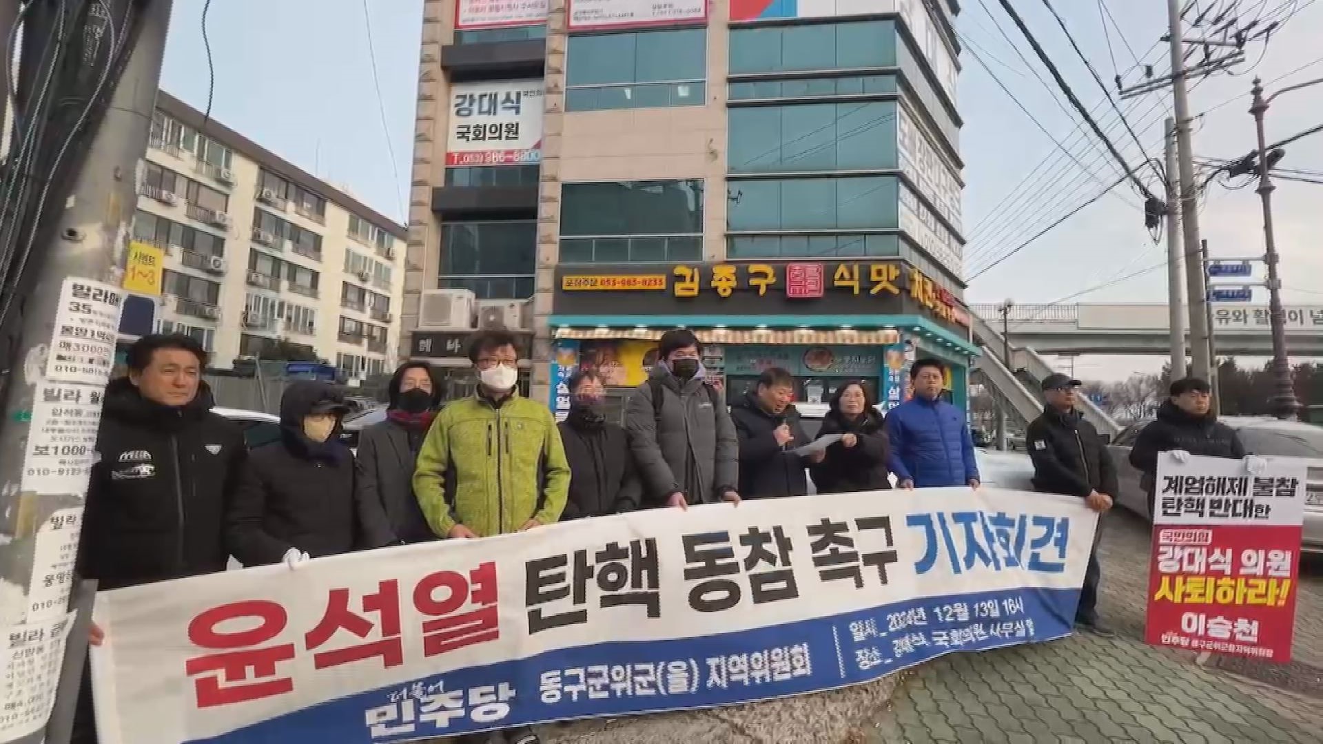 대구 지역 국회의원들을 향해 윤석열 탄핵 찬성을 촉구하는 기자회견이 12월 13일도 잇달았습니다.대구 동구군위군갑 최은석, 동구군위군을 강대식, 북구갑 우재준, 북구을 김승수 국회의원 사무실 앞에서는 각 지역구의 민주당 당원들이 모여 "국민의힘 국회의원은 14일 윤석열 탄핵에 동참하라"고 촉구했습니다.이들은 "...