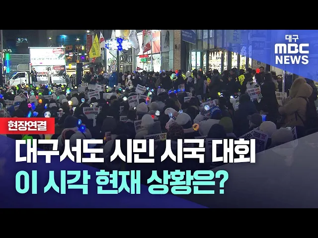 ◀앵커▶보수 지지층이 두터운 대구에서도 탄핵 투표에 동참을 요구하는 시민들의 집회가 열리고 있습니다.추운 날씨 속에서도 집회 열기가 뜨겁다고 하는 데요, 대구 동성로에 나가 있는 취재기자 연결해보겠습니다.권윤수 기자, 현장 상황 전해주시죠.◀기자▶윤석열 탄핵 촉구 시국 대회가 열리고 있는 대구 동성로에 나와 ...