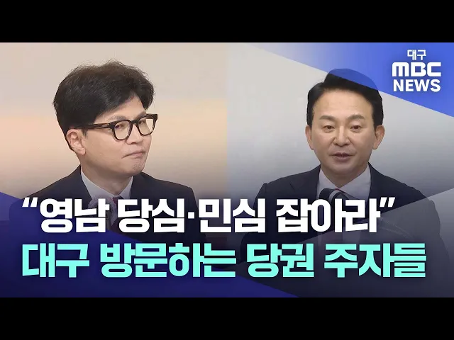 ◀앵커▶국민의힘 당권 주자들이 잇달아 대구를 찾으며 당심 공략에 나서고 있습니다.6월26일 원희룡 전 국토부장관이 대구를 찾은 데 이어 6월27일 한동훈 전 국민의힘 비상대책위원장이 대구에서 당원 간담회를 가졌습니다.당 대표 선거에서 이기기 위해선 영남권 당원들의 표심이 가장 중요하기 때문인데요.홍준표 대구시...