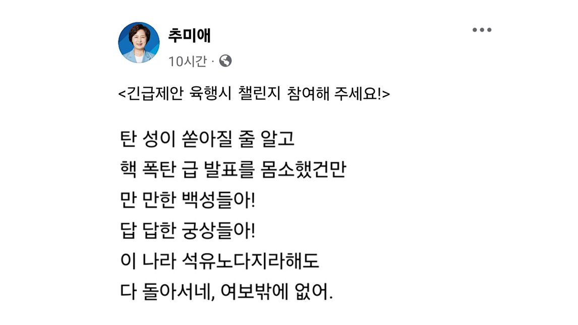 앞 글자만 읽으니 '탄핵만 답이다'···추미애, 대통령 겨냥한 6행시