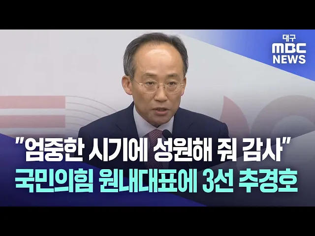 ◀앵커▶제22대 국회를 이끌어갈 국민의힘 새 원내대표로 3선의 추경호 의원이 선출됐습니다.대표적인 경제 관료 출신인 추 의원은 지방선거와 대선 승리를 위해 최선을 다하겠다고 밝혔습니다.보도에 권윤수 기자입니다.◀기자▶국민의힘 새 원내대표로 대구 달성군에서 3선에 성공한 추경호 의원이 선출됐습니다.5월 9일 국회...