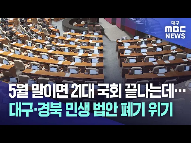 ◀앵커▶21대 국회 임기는 2024년 5월 29일 끝이 납니다.임기가 한 달도 채 남지 않은 가운데 지금 국회에선 임시회가 열려 상임위별로 막바지 법안 심사를 하고 있습니다.하지만 최근 본회의에서 야당이 채상병 특검법을 단독으로 처리한 뒤 여야 대립이 극으로 치닫고 있는데요,대구·경북 민생 법안이 처리되지 못하고 폐기...