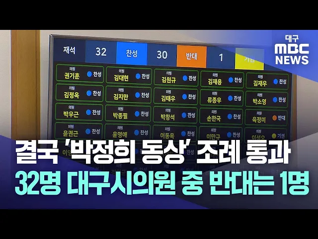 ◀앵커▶홍준표 대구시장이 제안해 추진하는 '박정희 전 대통령 동상' 건립이 급물살을 타고 있습니다.대구시의회가 '박 전 대통령 기념사업에 관한 조례안'을 가결한 겁니다.2024년 5월 2일 시의회 본회의에서 방청석에 앉아 있던 시민단체 회원들은 조례 가결에 반대하라고 목소리를 높였는데요,32명의 의원 중 1명만 반대...