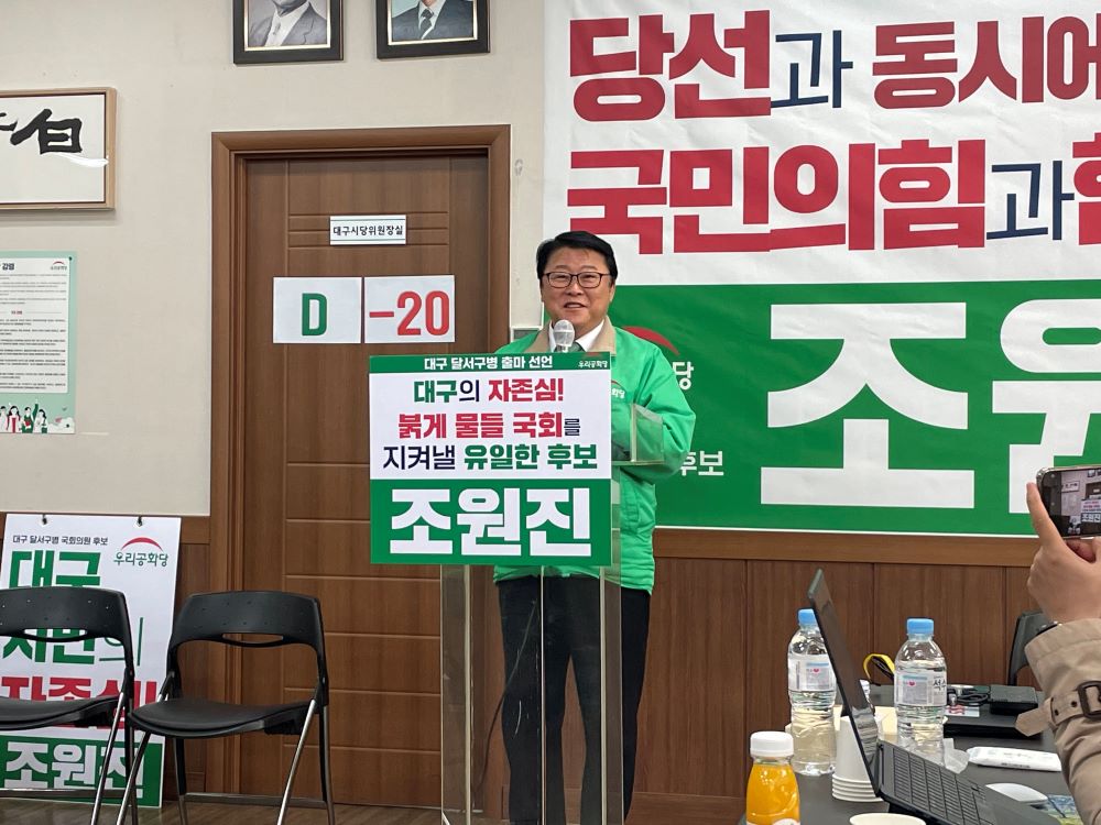 조원진 우리공화당 대표가 3월 21일 22대 국회의원 선거 대구 달서구병에 출사표를 던지고 대구 달서구 선거관리위원회에 후보로 등록했습니다. 조 대표는 "자신은 보수의 중심 대구를 가장 많이 닮은 정치인"이라면서 "달서병 국회의원을 3선 하면서 평생 머리부터 발끝까지 대구의 정신을 온몸으로 배웠고 실천했다"라고 ...