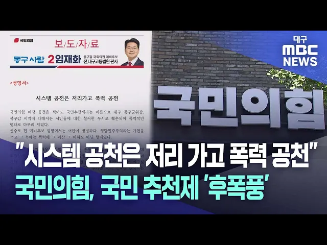 ◀앵커▶국민의힘 국민 추천제 공천 후폭풍이 거셉니다. 대구에서 활동한 경력이 거의 없고 이름조차 생소한 후보를 선거를 20여 일 앞두고 내리꽂았다는 비판이 나옵니다.공천을 신청했다가 탈락한 예비후보들은 반발하고 있는데요, 주민들은 무소속 후보 추대 움직임까지 보이고 있습니다. 보도에 권윤수 기자입니다.◀기자▶...