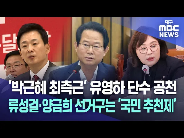 ◀앵커▶박근혜 전 대통령의 최측근이죠.유영하 변호사가 대구 달서구갑 선거구에 국민의힘 후보자로 단수 공천을 받았습니다. 해당 지역구의 현역인 홍석준 의원은 컷오프 됐습니다.류성걸 의원의 선거구인 동구군위군갑과 양금희 의원의 지역구 북구 갑에서는 국민 추천제를 통해 후보자를 정하기로 했습니다. 보도에 권윤...