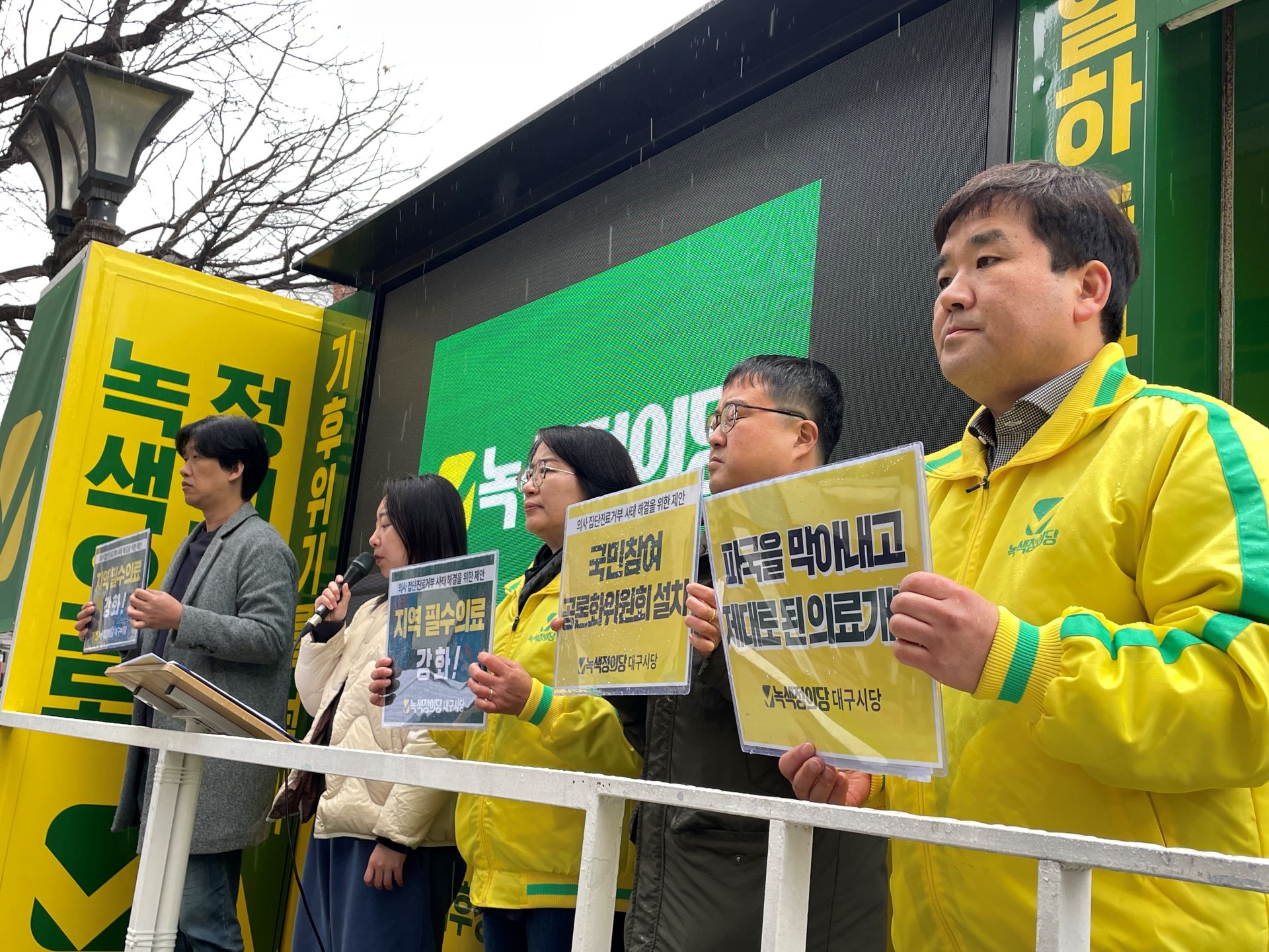녹색정의당 대구시당은 2월 29일 대구시청 앞에서 기자회견을 열고 의사 집단 진료 거부 사태를 해결하기 위한 3대 해법을 제안했습니다. 먼저 각계각층 시민이 참여하는 '국민 참여 공론화위원회'를 구성해 의협안, 정부안, 시민사회안 3가지를 놓고 숙의 토론할 것을 제안했습니다.또 의대 정원 확대 같은 미봉책 말고 지...