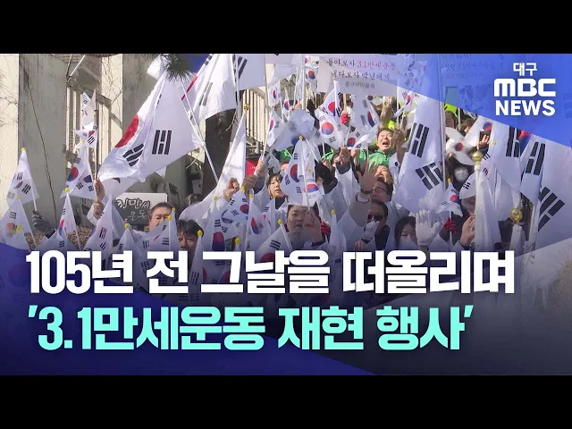 ◀앵커▶3.1절인 오늘 대구와 경북에서도 105주년을 기념하는 행사가 곳곳에서 열렸습니다.찬 바람이 부는 꽃샘추위에도 역사의 교훈을 잊지 말자는 외침은 이어졌습니다.'3.1만세운동길'이 위치한 대구 중구에서는 태극기를 든 시민들이 만세운동이 벌어진 그날을 재현하며 애국지사의 숭고한 정신을 기렸습니다.권윤수 기자...