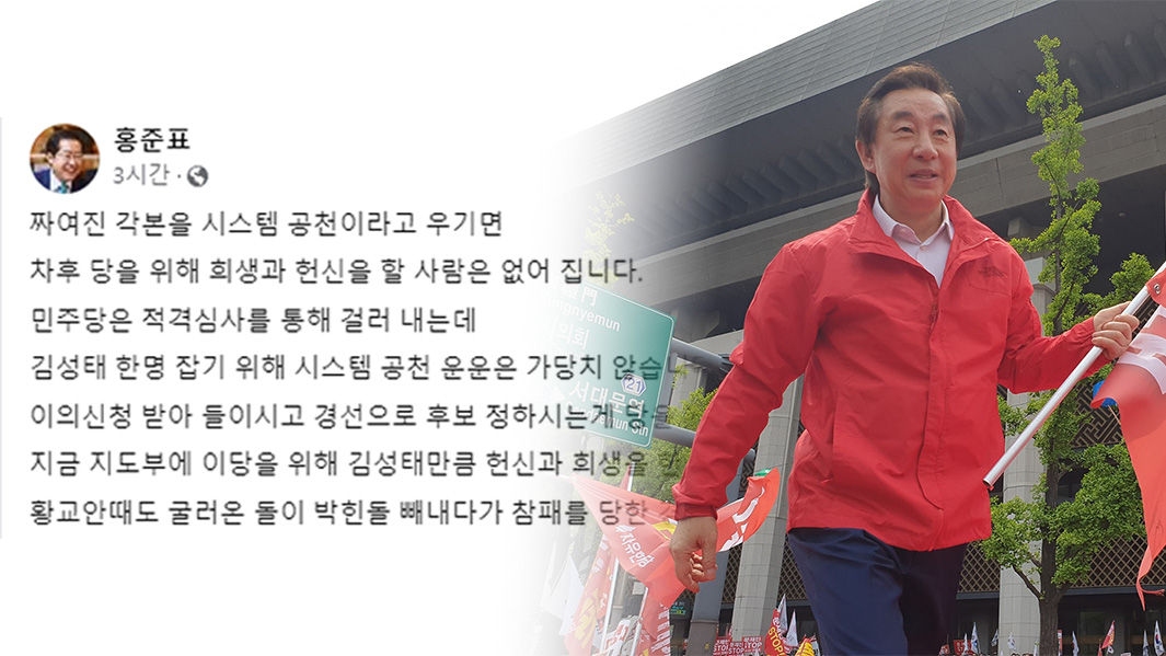 홍준표 대구시장은 "김성태 한 명 잡기 위해 시스템 공천 운운은 가당치 않다"라고 비판했습니다.홍 시장은 2월 13일 자신의 SNS를 통해 "짜인 각본을 시스템 공천이라고 우기면 차후 당을 위해 희생과 헌신을 할 사람은 없어진다"라고 지적했습니다. "민주당은 적격심사를 통해 걸러낸다"라며 "이의신청 받아들이고 경선으...