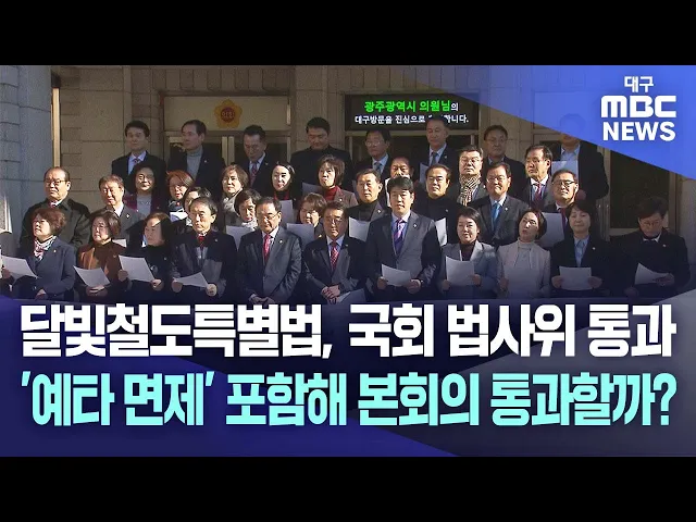 ◀앵커▶기획재정부의 반대로 막판 진통을 겪어 온 달빛철도 특별법이 1월 24일 국회 법제사법위원회를 통과했습니다. 25일 열릴 국회 본회의 통과에 청신호가 켜졌는데요.법사위가 열린 날 대구시와 광주시의회는 국회 본회의의 조속한 통과를 촉구하는 공동 성명을 발표하기도 했습니다.보도에 권윤수 기자입니다.◀기자▶◀현...