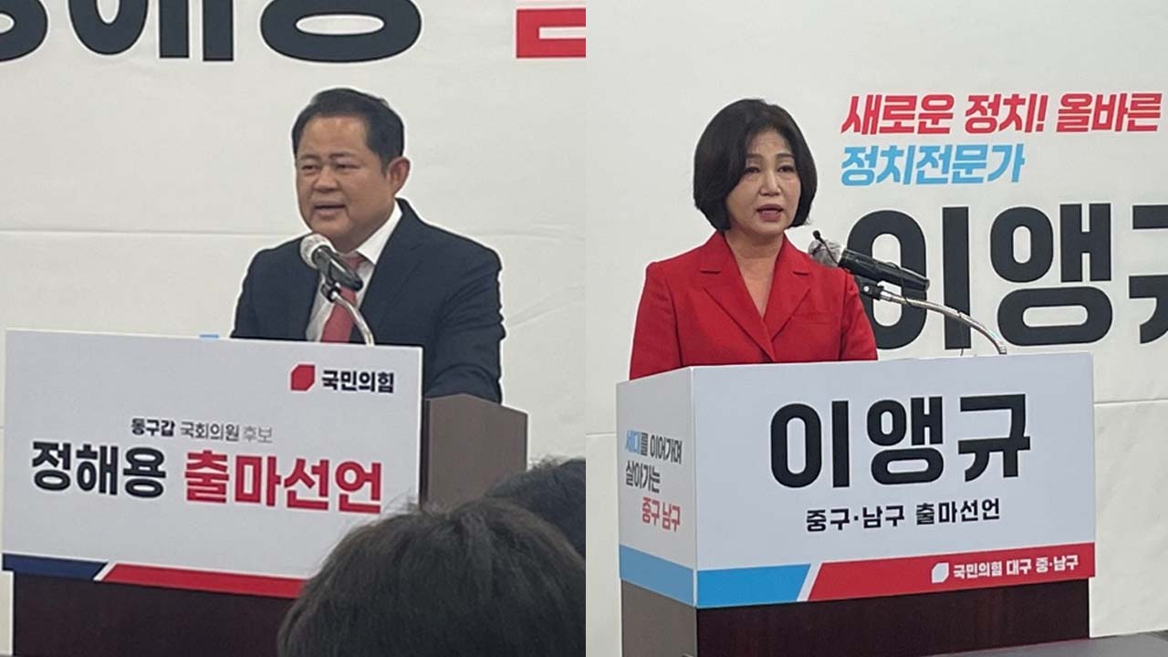 2024년 국회의원 선거의 예비후보 등록을 하루 앞두고 출마예정자들의 출마 선언이 이어지고 있습니다.정해용 전 대구시 경제부시장은 12월 11일 국민의힘 대구 동구 갑 출사표를 던지며 "동대구역과 역세권, 동대구 벤처벨리를 젊은이가 몰려드는 스타트업 허브로 만들겠다"는 공약을 발표했습니다. 이앵규 전 국민의힘 대...