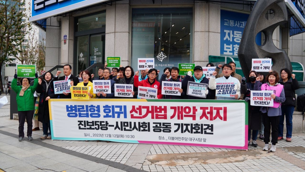 기본소득당, 노동당, 녹색당, 정의당, 진보당 등 5개 정당의 대구시당은 국민의힘과 더불어민주당에 선거법 개악 시도를 중단하라고 촉구했습니다.이들은 12월 12일 더불어민주당 대구시당 앞에서 기자회견을 열고 "최근 이재명 대표가 병립형 회귀나 위성정당을 유지한 준연동형으로 갈 수 있다는 뜻을 내비쳤다"면서 "역...