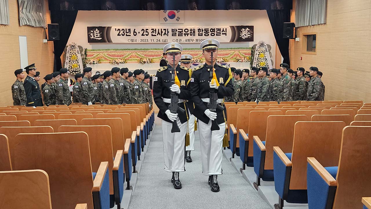 육군 50보병사단은 11월 24일 영천호국원에서 6.25 전사자 발굴 유해 합동 영결식을 거행했습니다. 50사단장 주관으로 진행된 영결식은 유해 발굴 관계자와 군위, 영천, 칠곡, 문경 지자체장, 보훈 단체장 등 100여 명이 참석한 가운데 경건하게 진행됐습니다. 50보병사단은 지난 4월부터 11월까지 낙동강 방어선 격전지였...