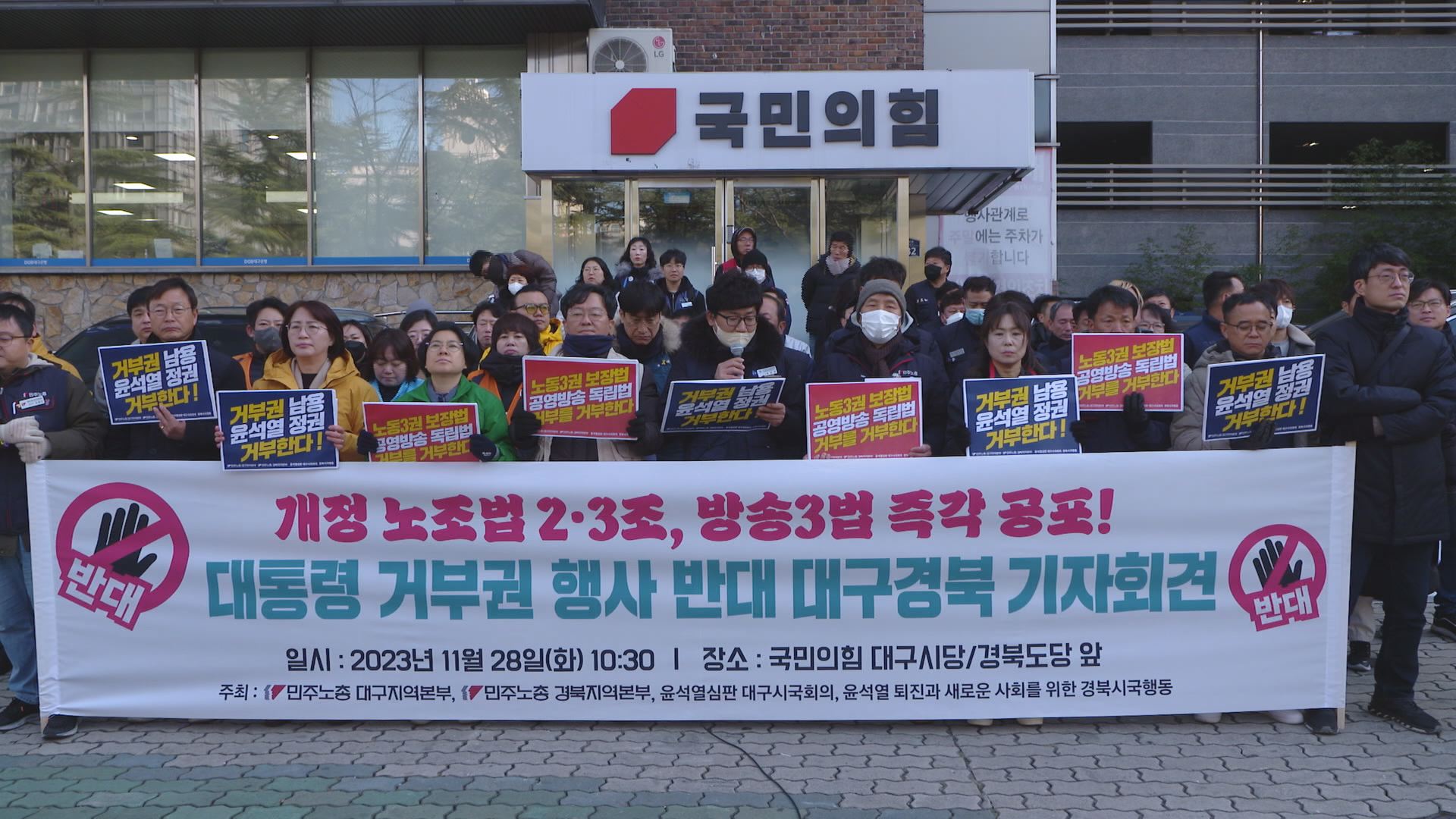 민주노총 대구·경북본부와 윤석열 심판 대구시국회의, 경북시국행동은 11월 28일 국민의힘 대구시당·경북도당 앞에서 기자회견을 열고, 이른바 '노란봉투법'과 방송3법 개정안에 거부권을 행사하기로 밝힌 윤석열 대통령을 규탄했습니다. 이들은 "노란봉투법은 낡은 법이 보호하지 못하는 특수고용 노동자 등을 법상 노동자...
