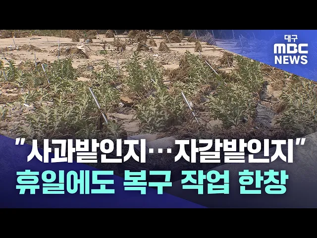 ◀앵커▶태풍 카눈으로 제방이 무너져 마을 곳곳이 물에 잠겼던 대구 군위에서는 8월 13일에도 복구 작업이 이어졌습니다.유실된 제방이 여러 곳이고, 농작물과 가축 피해가 커 복구가 완료되기까지는 시간이 꽤 걸릴 것으로 보입니다.권윤수 기자가 보도합니다.◀기자▶대구 군위군 부계면의 농기계가 드나들던 하천 제방 길이...