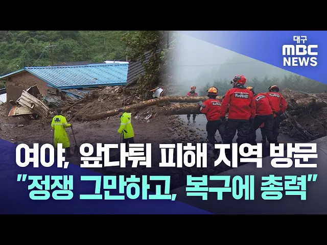 ◀앵커▶집중호우로 인한 엄청난 피해에 정치권도 정쟁을 멈추고 피해 복구에 총력을 기울이고 있습니다.여야 지도부가 잇따라 수해 현장을 찾고 있는데요.특히 민주당은 경북도당과 경기도당이 함께 수해 복구 지원단을 꾸려서 주민 지원에 나설 방침입니다.보도에 권윤수 기자입니다.◀기자▶국민의힘 김기현 대표는 7월 17일...