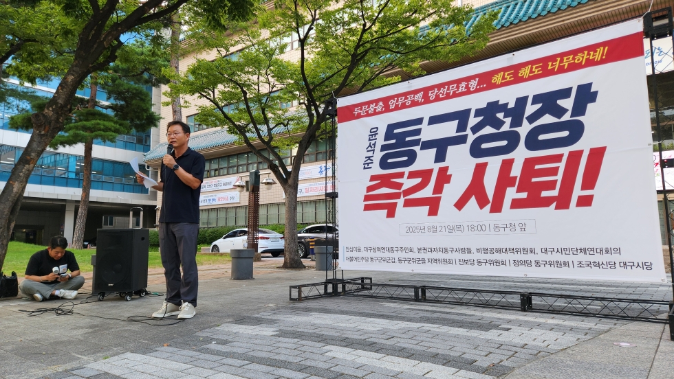대구 시민 사회 단체에서 직무 소홀을 이유로 윤석준 대구 동구청장에 대해 감사원에 공익 감사를 청구했지만, 감사에 해당하지 않는다는 답을 받았습니다.진보당 대구시당에 따르면, 감사원은 윤 청장이 '성실 의무와 직장 이탈 금지를 위반했다'라는 지적에 대해 "연가 일수를 초과해 사용하지 않았고, 결근했을 때 부구...