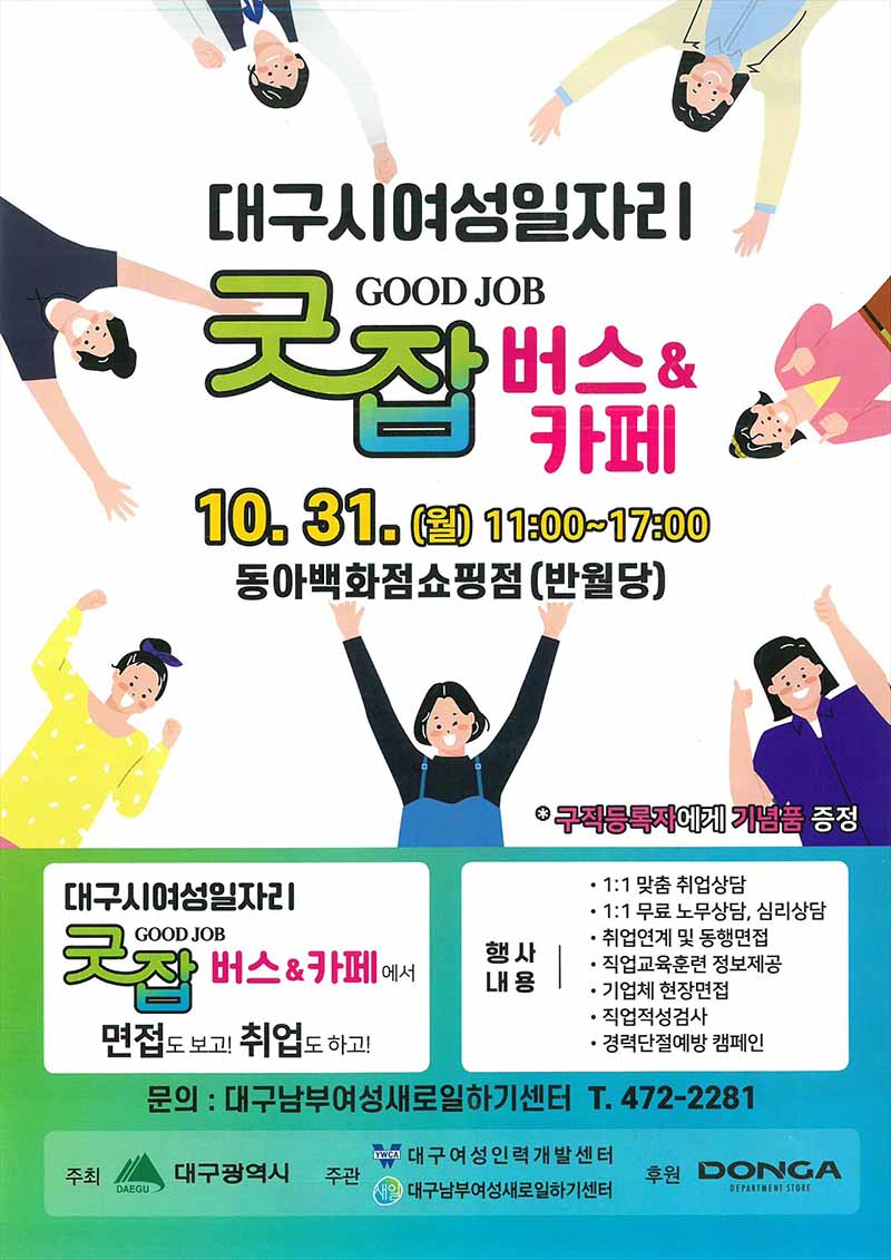 찾아가는 취업 상담 서비스 '굿잡 버스'가 10월 31일 오전 11시부터 대구 중구 동아백화점 쇼핑점 앞에서 운영됩니다.남부여성새로일하기 센터 주관으로 열리는 굿잡 버스에서는 산모·신생아 건강관리사와 요양보호사, 단순 제조 분야 등 8개 기업이 현장 면접을 통해 직원을 바로 채용합니다.1대 1 맞춤형 취업 상담과 적...