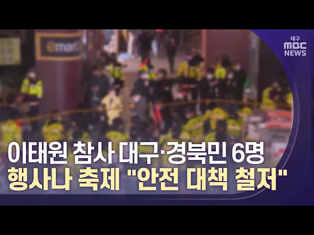 ◀앵커▶이태원 참사 희생자 가운데 대구·경북민도 6명 있는 것으로 확인됐습니다. 대구시와 경상북도는 유가족이 필요한 행정 지원에 적극적으로 나서기로 했습니다. 지역 축제와 행사는 가급적 취소나 연기하고, 개최할 경우에는 안전 대책을 꼼꼼히 챙기기로 했습니다. 보도에 권윤수 기자입니다. ◀기자▶이태원 참사 희생...