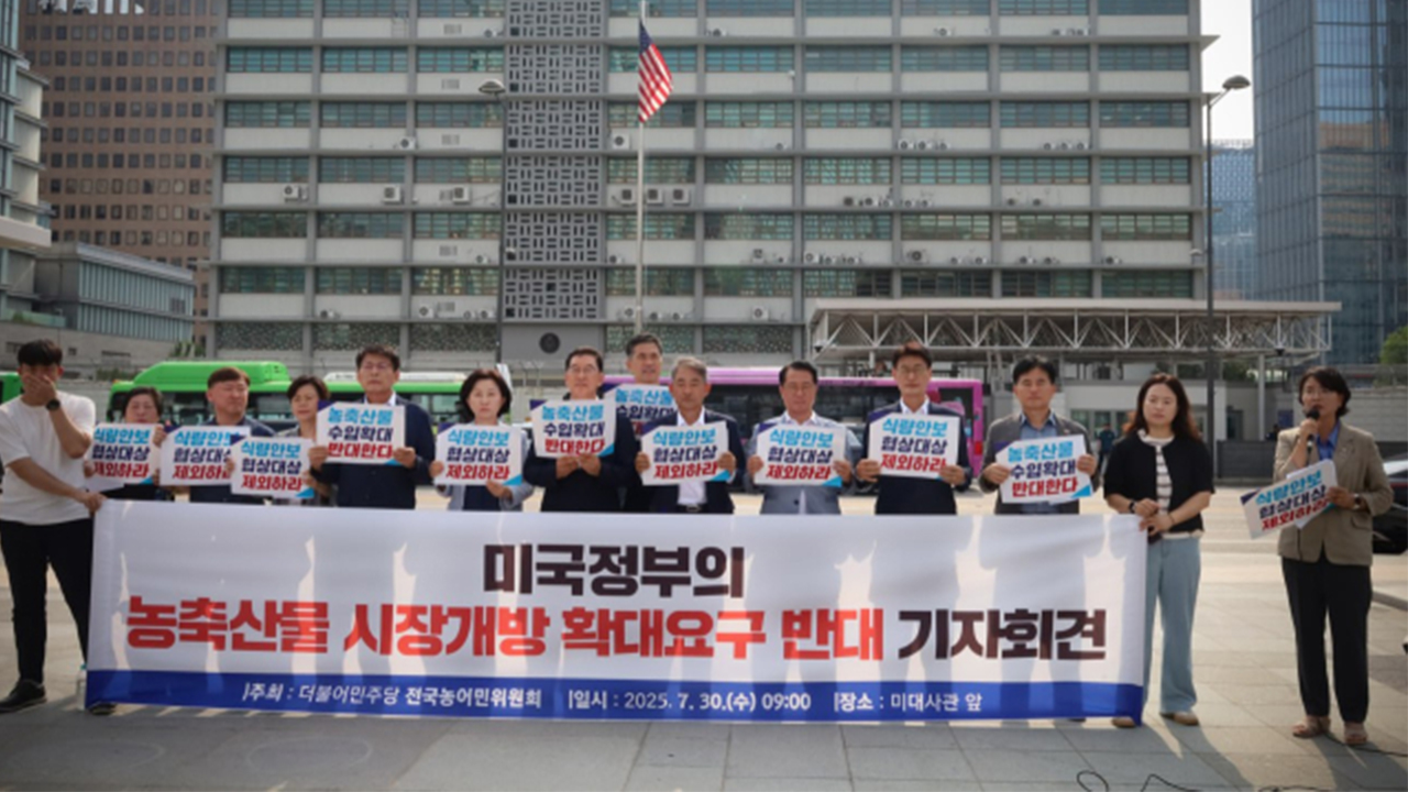 사진 제공 임미애 더불어민주당 의원실임미애 더불어민주당 전국 농어민위원장은 미국의 일방적인 농축산물 시장 개방 요구에 "대한민국 식량 주권을 짓밟는 행위이자 농민의 생존권을 빼앗는 일"이라고 주장했습니다.임 위원장을 비롯해 민주당 전국 농어민위원회 소속 의원들은 7월 30일 미국 대사관 앞에서 기자회견을 ...