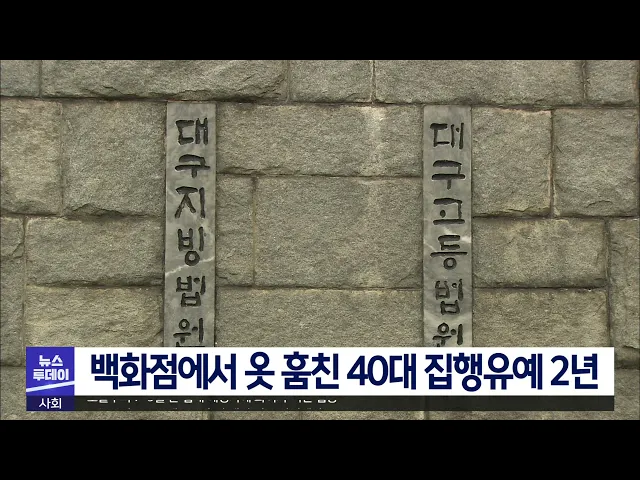 대구지방법원 이정목 판사는 절도 혐의로 기소된 48살 A 씨에게 징역 6개월에 집행유예 2년을 선고하고 보호관찰을 받을 것을 명령했습니다.A 씨는 지난해 12월부터 지난 1월까지 대구의 한 백화점에서 5차례에 걸쳐 350만 원어치의 옷을 훔친 혐의로 재판에 넘겨졌습니다.