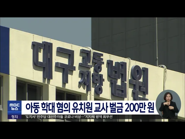 대구지방법원 김재호 판사는 아동학대 혐의로 기소된 30살 A 씨에 대해 벌금 200만 원을 선고하고 40시간의 아동 학대 치료 프로그램 이수를 명령했습니다.A 씨는 대구의 한 유치원 교사로 일하면서 지난해 10월, 5살 어린이가 책상에 밥풀을 붙였다는 이유로 양팔을 잡아 마구 흔들고 팔을 힘껏 잡아당겨 상처를 입힌 혐의...