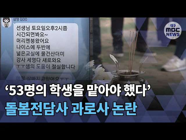◀ANC▶대구의 한 초등학교의 돌봄전담사가새로 발령받은 학교에 출근한 지 얼마 지나지 않아 갑자기 숨을 거뒀습니다.돌봄전담사 노조는인사 발령으로 업무량이 급격히 늘어나 과로사한 것이라 주장하고 있습니다.권윤수 기자가 취재했습니다. ◀END▶ ◀VCR▶대구시교육청 앞에 임시분향소가 차려졌습니다.지난 15일 ...