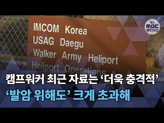대구 안전생활실천 시민연합이 환경부로부터 입수해 공개한 자료에 따르면캠프워커의 발암 위해도가, 땅을 주거지역으로 이용할 경우'만 분의 2.2'로 나타나 만 명 중 2명 이상이암에 걸릴 확률로 조사됐습니다.환경부는 10만 명 가운데 1명이 암에 걸릴 확률 즉 10만 분의 1까지만 안전한 것으로 기준을 제시하고 있습니다...