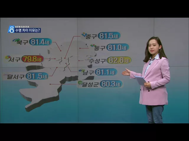 '한국 건강 형평성 학회'가 공개한 '전국 건강 불평등 현황'에 따르면 대구 수성구 주민들의 기대 수명은 82.6세로 8개 구군 가운데 가장 높았습니다. 달서구와 중구가 81.8세로 뒤를 이었고 서구의 경우 79.8세로 대구에서 가장 낮았고 전국 250여개 기초단체 중에서도 221위를 기록했습니다. 대구시민들의 전체 평균 기대...