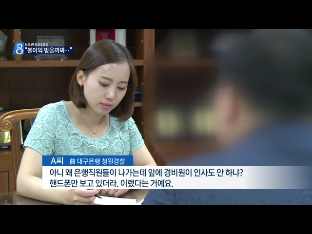 대구은행은 정규직 직원이 청원경찰 등 협력사 직원의 인격을 무시한 행동이 잦았다는 주장과 관련해 앞으로 협력사 직원들의 처우 개선에 힘쓰겠다고 밝혔습니다. 또 협력사 직원들이 부당한 대우를 받고도 무기계약직 전환을 위한 고객만족도 평가 때문에 항의하지 못했다고 밝힘에 따라 고객만족도 평가 폐지를 검토하겠...