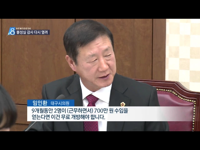 ◀ANC▶ 대구시설관리공단에 대한 행정사무감사가 지난 주 금요일 열렸다가 돌연 중단됐습니다. 감사자료는 오류투성이였고 답변 태도도 무성의했기 때문인데, 오늘 감사가 다시 열렸습니다. 권윤수 기자입니다. ◀END▶ ◀VCR▶ 지난 18일 자료와 태도가 무성의해 다시 열린 대구시설관리공단 행정사무감사는 김호경 이...