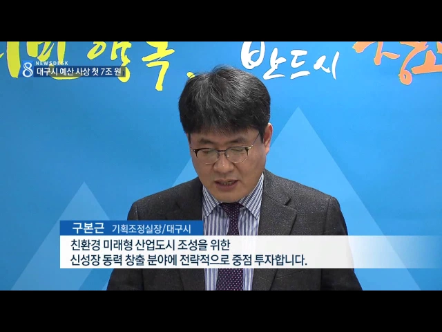 ◀ANC▶ 대구의 한 해 예산이 처음으로 7조원을 돌파할 것으로 보입니다. 미래 신성장 동력 산업 예산이 2배로 늘었는데 자세한 내년도 예산안, 권윤수 기자가 보도합니다. ◀END▶ ◀VCR▶ 대구시의 내년도 예산안의 규모는 7조 895억 원으로 올해 예산보다 2천 681억 원, 3.9% 늘었는데, 7조원을 넘긴 건 처음입니다. ...
