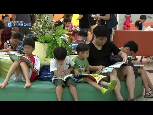 ◀ANC▶ 계속되는 폭염을 피해 매일 계곡이나 바닷가에 갈 수도 없고 피서 고민 많이 하실텐데요. 요즘은 냉방이 잘 되는 도서관이나 대형마트가 도심피서지로 각광받고 있습니다. 이상원 기자가 보도합니다. ◀END▶ ◀VCR▶ 어린이들이 옹기종기 모여 앉아 독서삼매경에 빠졌습니다. 엄마와 아빠가 읽어주는 동화책에 ...