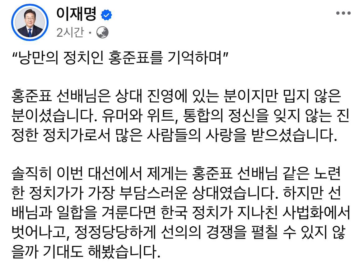 이재명 더불어민주당 대선 후보는 정계에서 은퇴한 홍준표 전 대구시장이 '가장 부담스러운 상대'였다며 연일 홍 시장을 좋게 평가했습니다.이 후보는 5월 12일 자신의 SNS에 '낭만의 정치인 홍준표를 기억하며'라는 글을 올렸습니다. "홍준표 선배님은 상대 진영에 있는 분이지만 밉지 않은 분이다. 유머와 위트, 통합의 ...