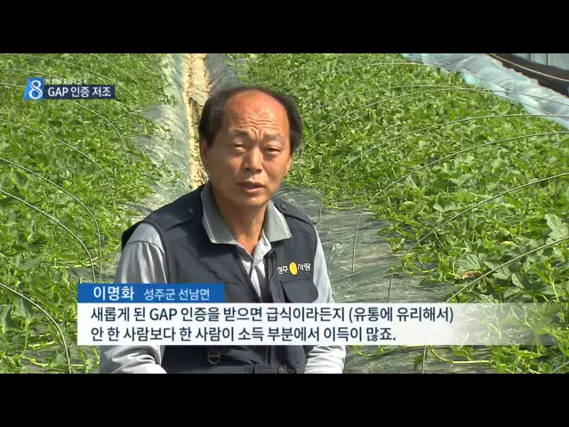 ◀ANC▶ 혹시 농산물 GAP(지에이피) 인증 제도라고 들어보셨습니까? 농산물의 생산부터 포장, 유통단계까지 안전성을 확보하는 제도인데요. 이 제도가 도입된지 10년이나 됐지만 '유기'나 '무농약' 같은 친환경 인증 제도에 밀려 자리를 잡지 못하고 있습니다. 권윤수 기자가 취재했습니다. ◀END▶ ◀VCR▶ 성주군 선남...