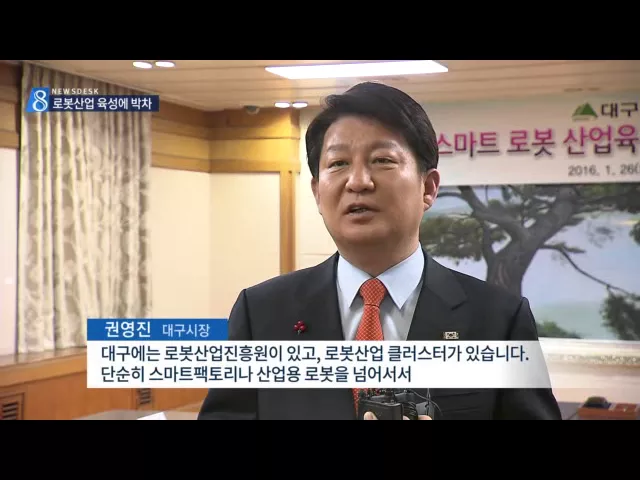 ◀ANC▶ 대구시가 첨단로봇 생산기업인 한화테크윈과 업무협약을 체결하고, 로봇산업 육성에 본격적으로 나서기로 했습니다 여] 한화테크윈은 대구에 스마트 로봇 연구센터를 짓기로 했는데, 대구가 공을 들이고 있는 로봇산업 육성이 탄력을 받을 전망입니다. 권윤수 기자입니다. ◀END▶ ◀VCR▶ 경남 창원에 본사를 ...