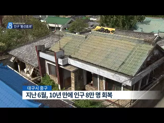 ◀ANC▶ 대구에서는 최근 5년사이 신규 주택단지 개발로 구,군별 인구 이동이 많았습니다. 특히, 중구의 경우 10년만에 인구 8만 명을 회복했는데, 대구시 전체로보면 여전히 인구가 줄고 있어 걱정입니다. 권윤수 기자가 보도합니다. ◀END▶ ◀VCR▶ 현재 대구시 동구의 인구는 약 35만 명으로 5년 전보다 2만 명 가량...