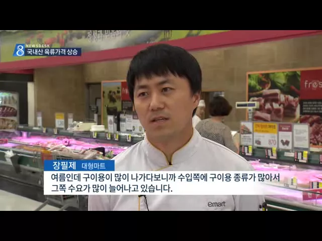 ◀ANC▶ 최근 한우와 국내산 돼지고기 값이 많이 올랐습니다. 특히 한우 1등급 도매가격은 2년전보다 무려 40% 올랐는데, 국내산 육류 가격의 강세는 추석까지 이어질 전망입니다. 권윤수 기자가 취재했습니다. ◀END▶ ◀VCR▶ 대구시내 한 대형마트. 국내산 삼겹살은 100그램에 2천 200원인데 캐나다산 삼겹살은 천 28...
