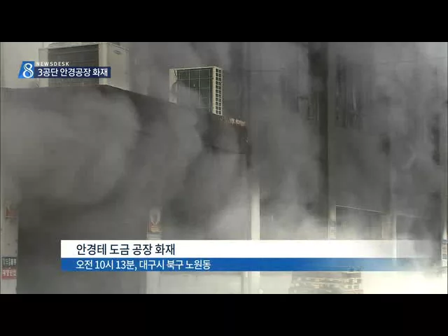◀ANC▶ 안경산업특구로 지정된 대구 3공단의 한 공장 건물에서 불이 나 안경테 제조 시설을 비롯한 건물 내부를 모두 태우고 2시간여만에 꺼졌습니다. 권윤수 기자입니다. ◀END▶ ◀VCR▶ 소방관들이 불이 난 건물에 연신 물을 뿌려 보지만 불은 좀처럼 꺼지지 않고 시커먼 연기만 계속 올라옵니다. 오늘 오전 10시 13...