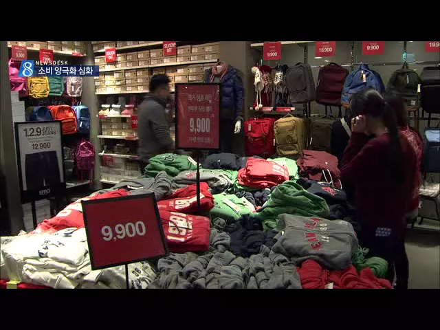 ◀ANC▶ 오랜 경기침체로 소비자들이 값이 싼 물건만 골라서 구매하는 경향이 두드러지고 있습니다. 여] 반면 고소득자들은 씀씀이를 그대로 이어가 소비 양극화가 심화되고 있습니다. 권윤수 기자가 취재했습니다. ◀END▶ ◀VCR▶ 한 대형마트에서 3천원짜리 티셔츠와 6천원짜리 보온내복이 등장했습니다. 겨울 의류와...
