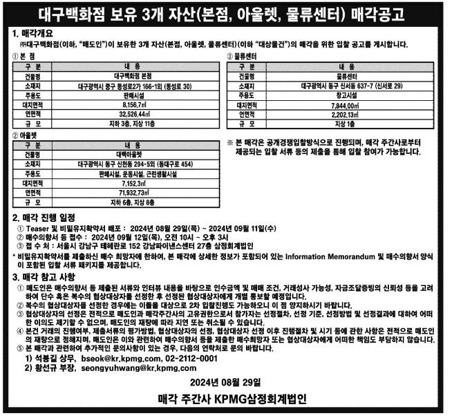 경영난을 겪고 있는 대구백화점이 유동성 확보를 위해 본점과 아울렛, 물류센터를 공개 매각합니다.대구백화점은 8월 29일 자 조간신문 3곳에 매각 주간사인 KPMG삼정회계법인 명의로, 보유 중인 3개 자산을 매각한다고 공고했습니다.매각 대상은 지난 2021년 7월 1일 폐점한 대구 동성로 본점과 현대백화점에 임대 중인 대...
