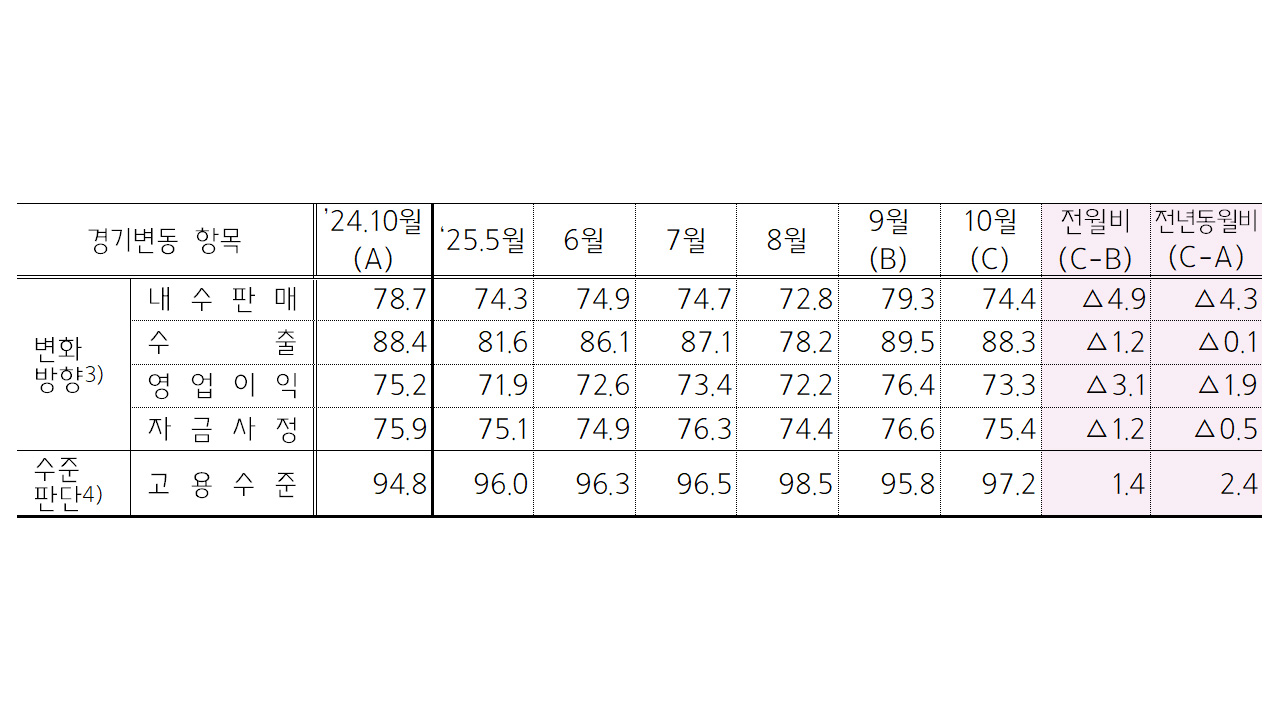 10월 중소기업 경기전망지수가 전월 대비 4.9 포인트 하락했습니다.중소기업중앙회가 지난 9월 12일부터 18일까지 3,087개 중소기업을 대상으로 '2025년 10월 중소기업 경기 전망 조사'를 실시한 결과, 10월 업황 전망 경기 전망 지수(SBHI)는 75.4로 전월 대비 4.9 포인트 떨어졌습니다. 제조업은 6.5 포인트 하락한 76.6,...