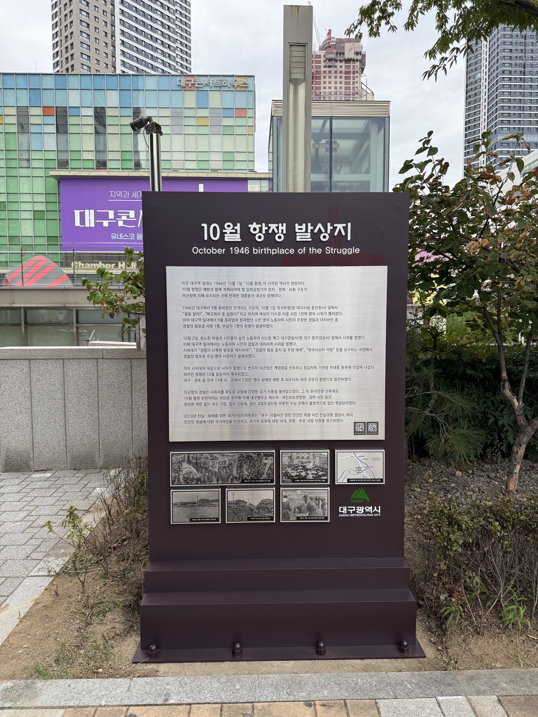 대구 10월항쟁 발상지 표지판이 옛 대구역 자리 인근 대구콘서트하우스 앞에 설치됐습니다.표지판에는 일제 잔재 미청산과 미군정 당시 식량 위기 같은 대구 10월 항쟁의 발생 경위와 전개 과정, 항쟁의 규모와 함께 한국전쟁 전후 민간인 학살로 이어진 경과를 적었습니다.진실·화해를 위한 과거사정리위원회는 지난 2010...