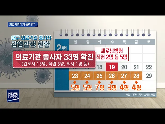 ◀ANC▶다수의 사망자를 낸 청도 대남병원의 사례에서 보듯, 만성 질환이 있거나 중증인 환자가 코로나 19에 감염되면 위중한 상태로 발전할 가능성이 높아, 의료진 감염을 막는 것이 매우 중요한데요.대구에서 코로나 19 확진 환자가 급증하면서환자들과 밀접하게 접촉할 수밖에 없는의료기관 종사자들의 감염 사례가 잇...