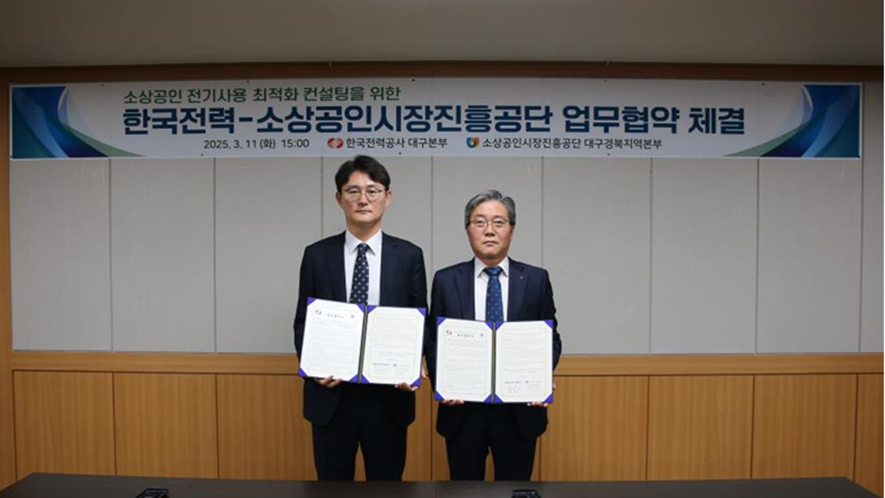 사진 제공 소상공인시장진흥공단 대구경북지역본부소상공인시장진흥공단 대구경북지역본부와 한국전력공사 대구본부가 3월 11일 지역 소상공인의 전기요금 부담 완화를 위한 업무협약을 체결했습니다. 협약에 따라 양 기관은 소상공인 전기 사용 최적화 컨설팅, 전통시장과 소상공인의 전기요금 민원 해소 등을 추진할 계획...