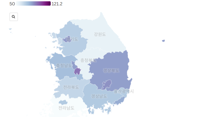 A Flourish map11월 대구의 아파트 분양 전망 지수가 소폭 하락했습니다.주택산업연구원이 주택 사업자들을 대상으로 설문 조사한 결과, 11월 대구의 아파트 분양 전망 지수는 10월(87.5)보다 1.1 포인트 떨어진 86.4로 전망됐습니다. 경북은 10월(75.0)보다 8.3 포인트 오른 83.3으로 집계됐습니다. 전국 평균은 19.4 포인...