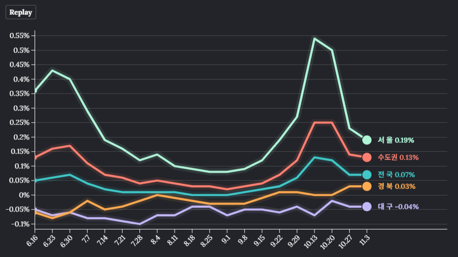 A Flourish chart대구의 아파트 매매가격이 101주째 하락했습니다.한국부동산원의 2025년 11월 첫째 주(11월 3일 기준) 주간 아파트 가격 동향을 보면 대구의 아파트 매매가격은 한 주 전보다 0.04% 떨어졌습니다. 전셋값은 0.03% 오르며 6주 연속 상승세를 이어갔습니다. A Flourish chart경북은 매매가격 0.03% 상승, 전...