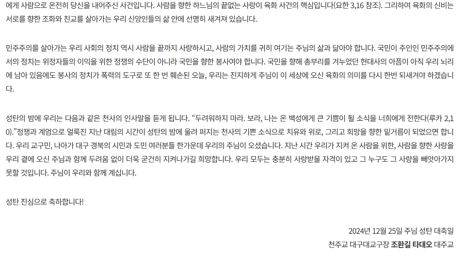 천주교 대구대교구장인 조환길 대주교가 지난 12·3 내란사태를 비판하는 성탄 담화문을 발표했습니다.조 대주교는 성탄절을 하루 앞둔 12월 24일 천주교 대구대교구 인터넷 홈페이지에 올린 '2024년 교구장 성탄 담화문'에서 "지난 1년 우리 사회는 대립과 갈등의 시간을 애써 견뎌왔습니다. 저마다 지닌 가치관과 저마다 ...